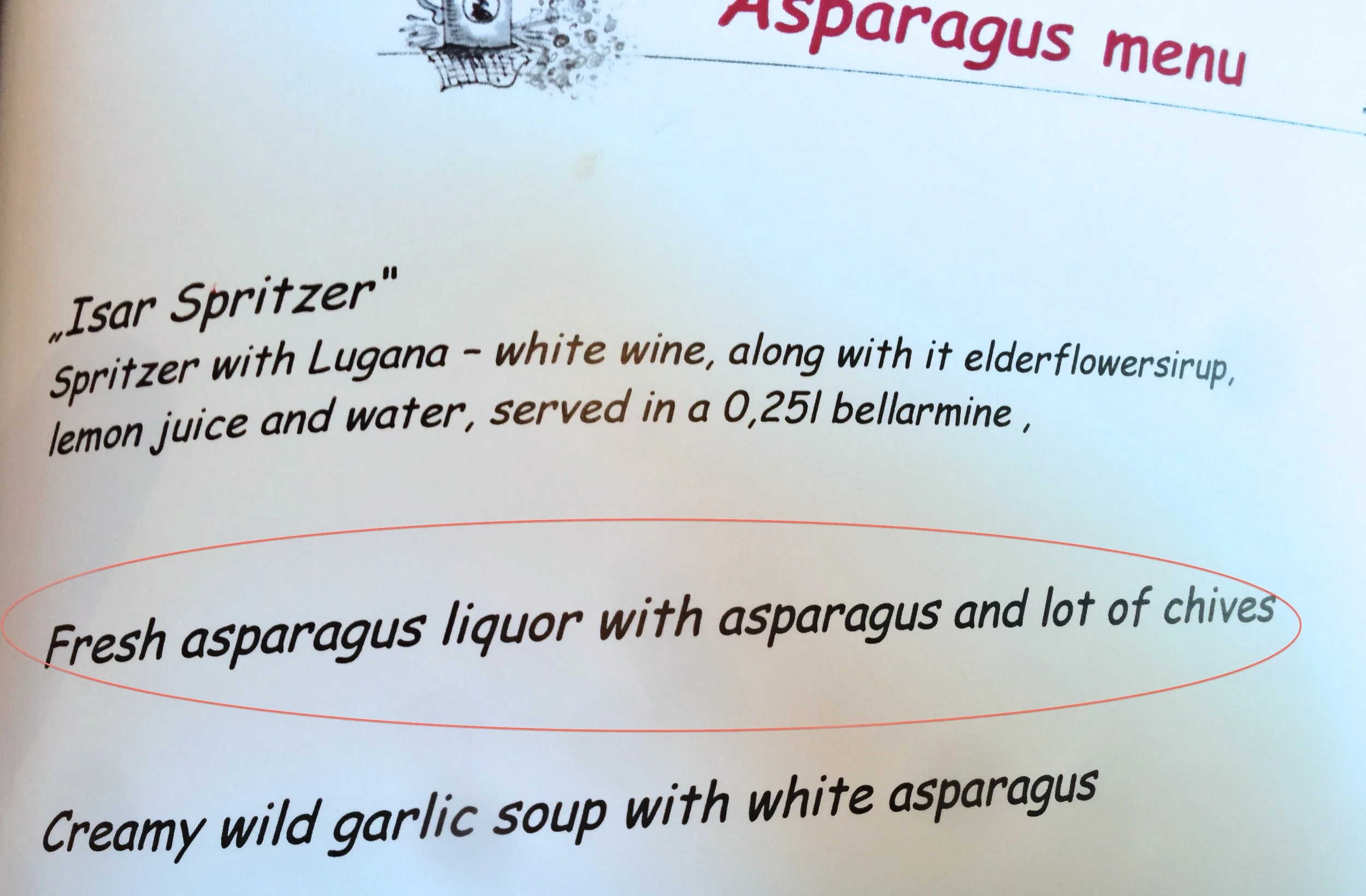 Restaurant menus will undoubtedly have a page dedicated to imaginative asparagus preparations, café blackboards list numerous daily spargel/asparagi specials and wait staff enthusiastically recommend regional wines that perfectly match the flavor of the celebrated spears.