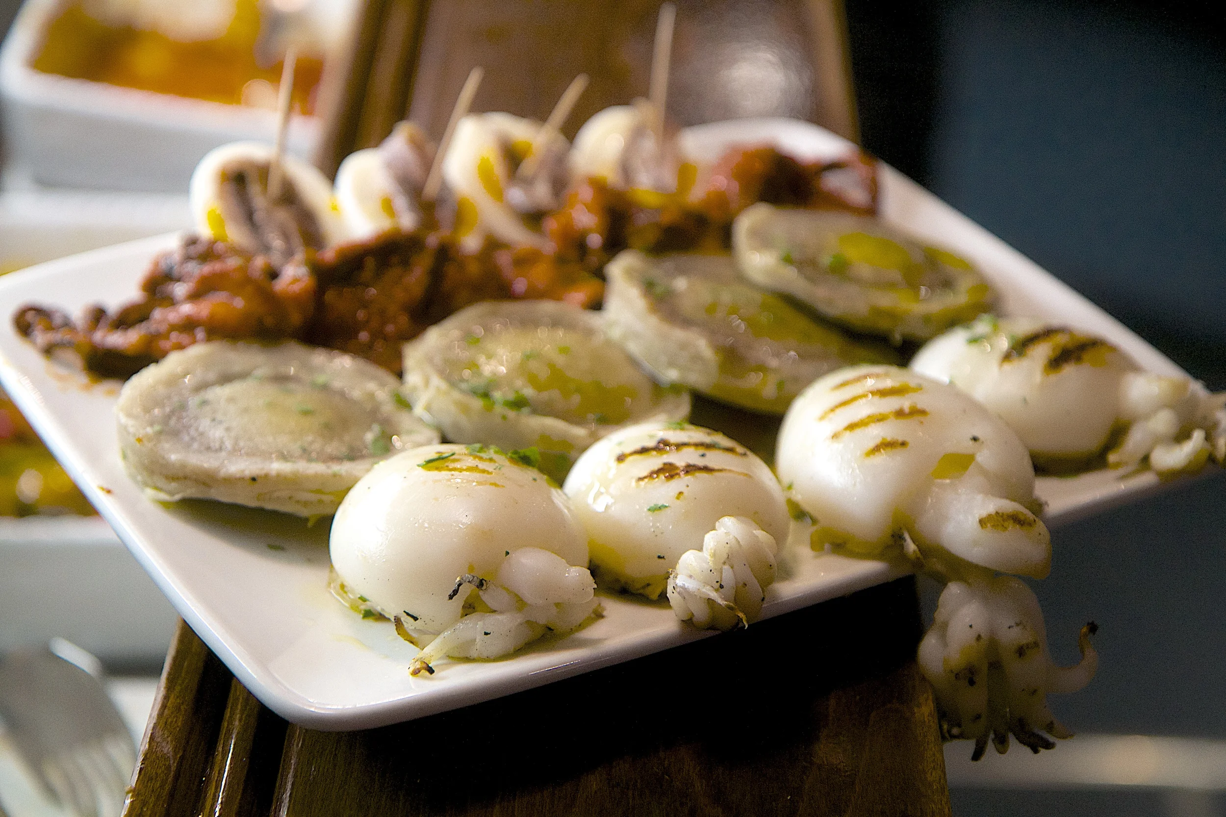This is another classic cicchetti selection. Sardines are cleaned, fried, and then placed in a marinade of vinegar, onions, raisins and pine nuts. It goes really well with a white Veneto wine such as a Soave Classico. I love these.